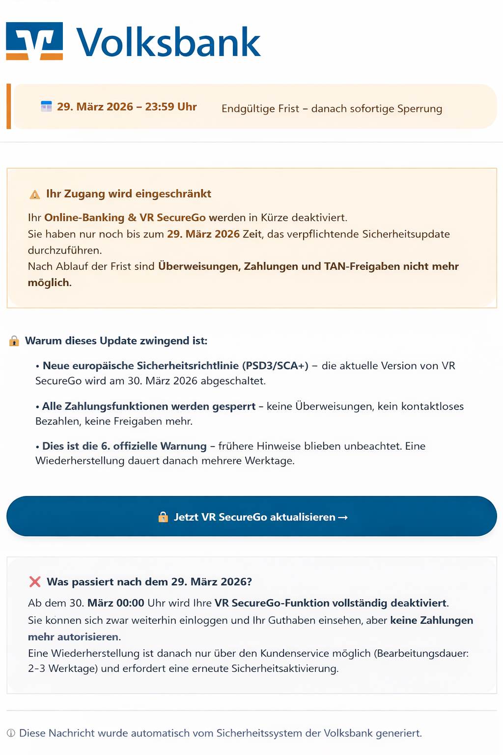 - Es kursiert eine Phishing-Mail zum angeblichen „Pflichtupdate“ der VR SecureGo App